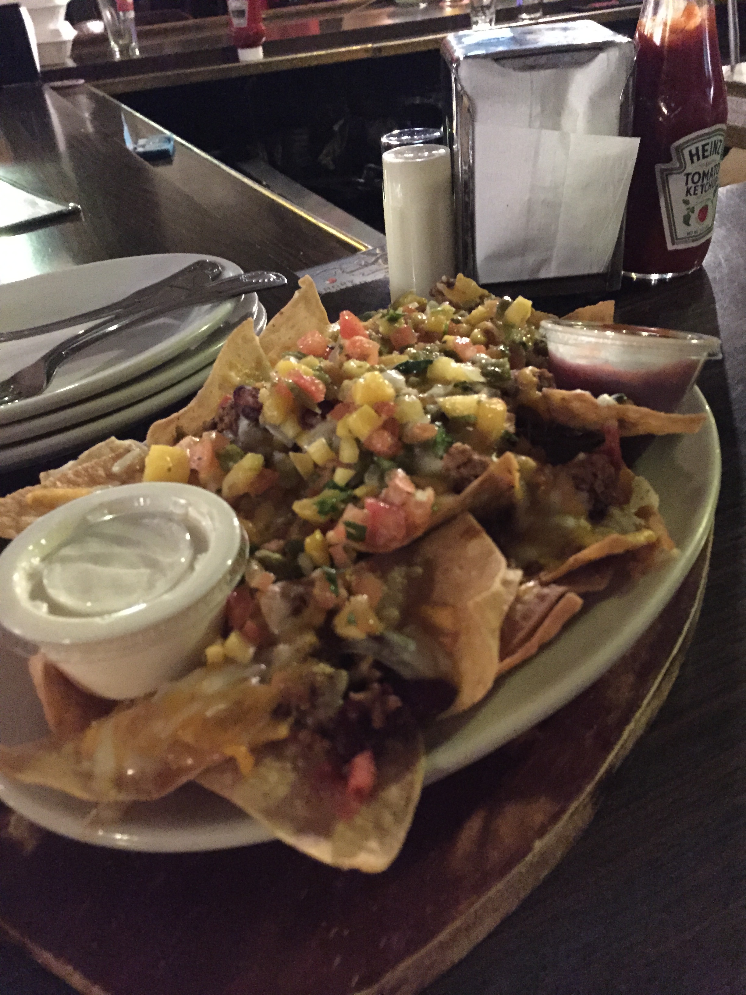 These chili covered nachos are well above average bar nachos. We ignored the plastic cups of sour cream and salsa, and focused on the heart of the matter. I’m giving thumbs up to them; the pineapple salsa was good, and it was important to get some food in the belly before doing some liver damage.