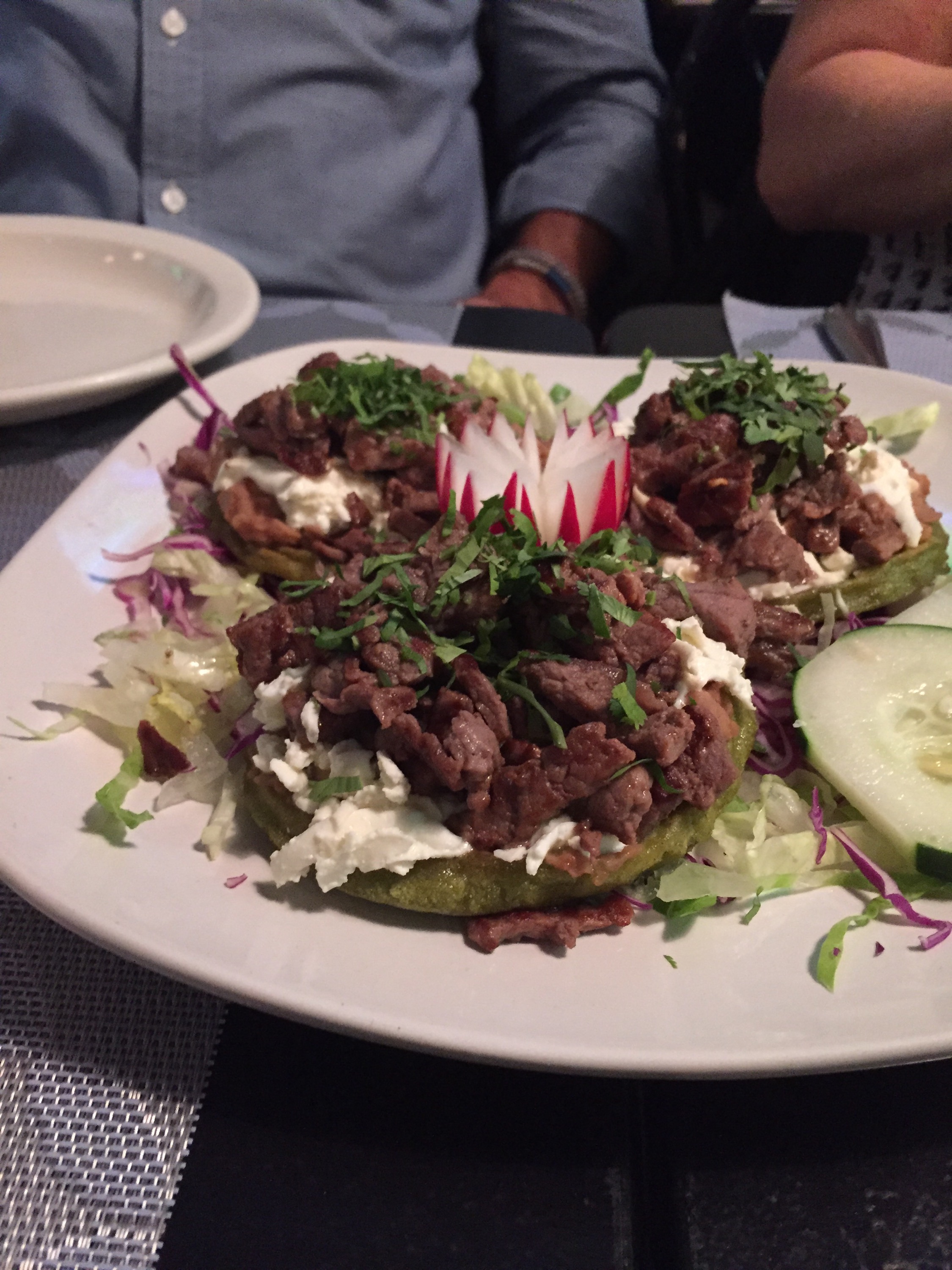 I am pretty sure that we ordered the nachos mixtos, which come with refried beans, ground beef, shredded chicken breast, chorizo, crema, cheese, shredded lettuce and pico de gallo.
